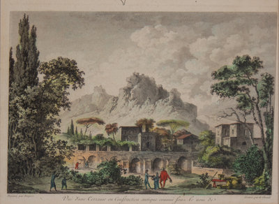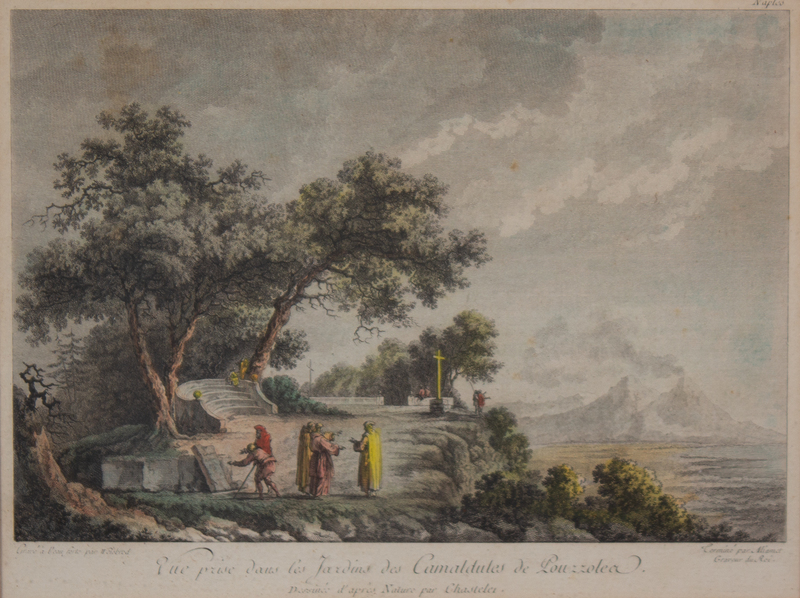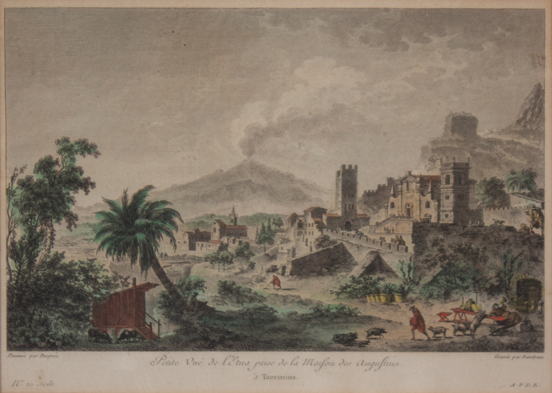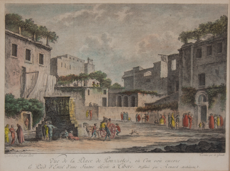 Comprising Vue d'ane Terrasse ou Construction antique counue four le nom de..., after Deprez, engraved by de Ghendt, Vue de la Place de Pouzzoles...after de Ghendt, Vue prise dans les Jardins des Camaldules de Pouzzolea, engraved by Aliamet, Graveur du Roi, and Petite Vue de 'Etna prise de la Maifou des Augufhur, engraved by Dambrun; each framed.