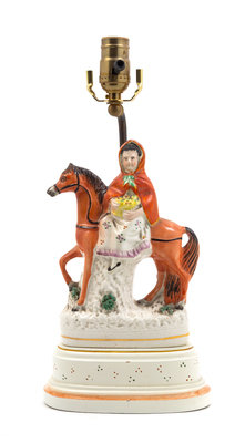 Depicting a woman riding a horse side-saddle, mounted as a lamp.