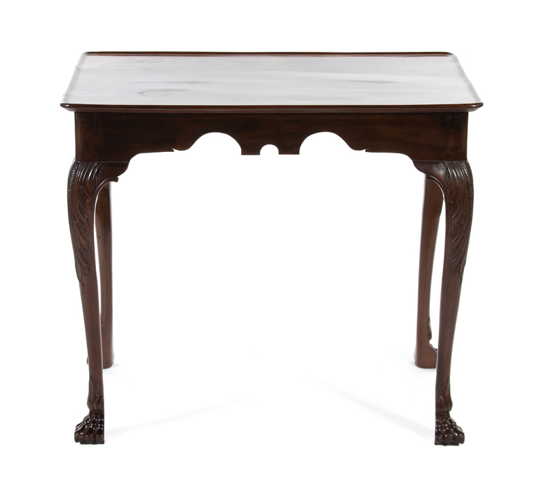 The rectangular top with lipped edge over a scalloped apron on either side, raised on foliate-carved cabriole legs ending in animal paw feet.