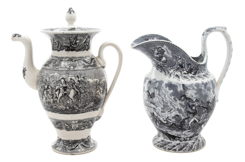 Decorated in black with bands of Napoleonic symbols and a large battle scene, marked 'Napoleon/JB Caffellemans at New Smith & Y..'; the pitcher decorated on the exterior and interior lip with Napoleonic battle scenes, Boch Freres.