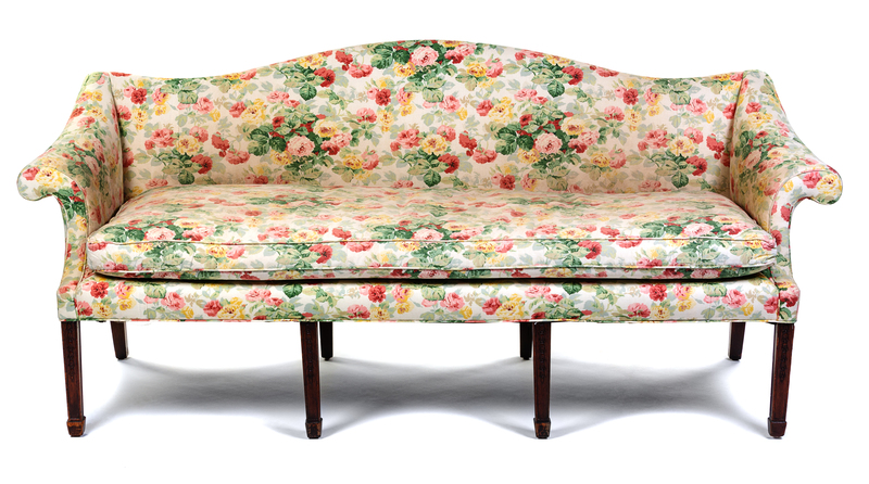 The arched and padded back over out-scrolled arms and a cushion seat, raised on tapering square legs ending in spade feet, with later floral upholstery.