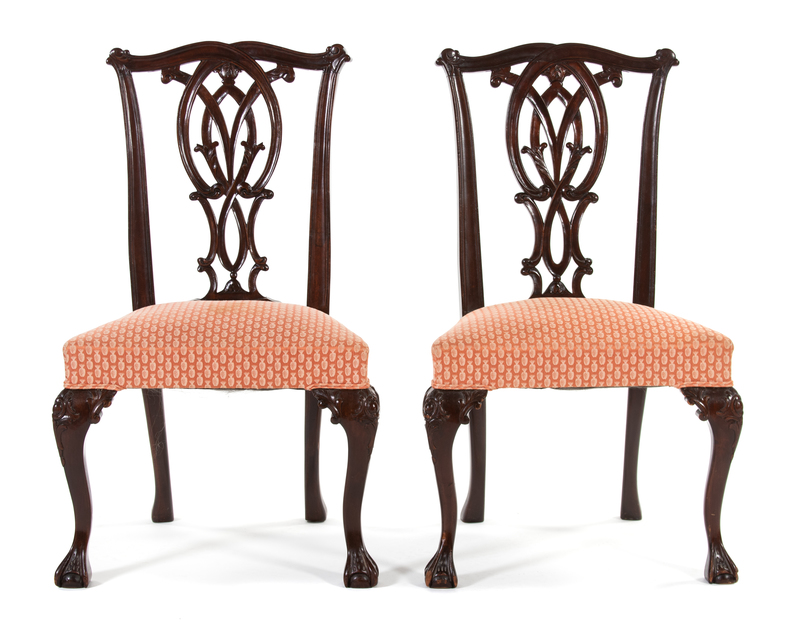 Each with shaped crestrail over a pierced and interlaced splat, the flared seat raised on cabriole legs ending in claw-and-ball feet.
