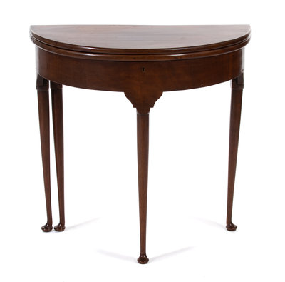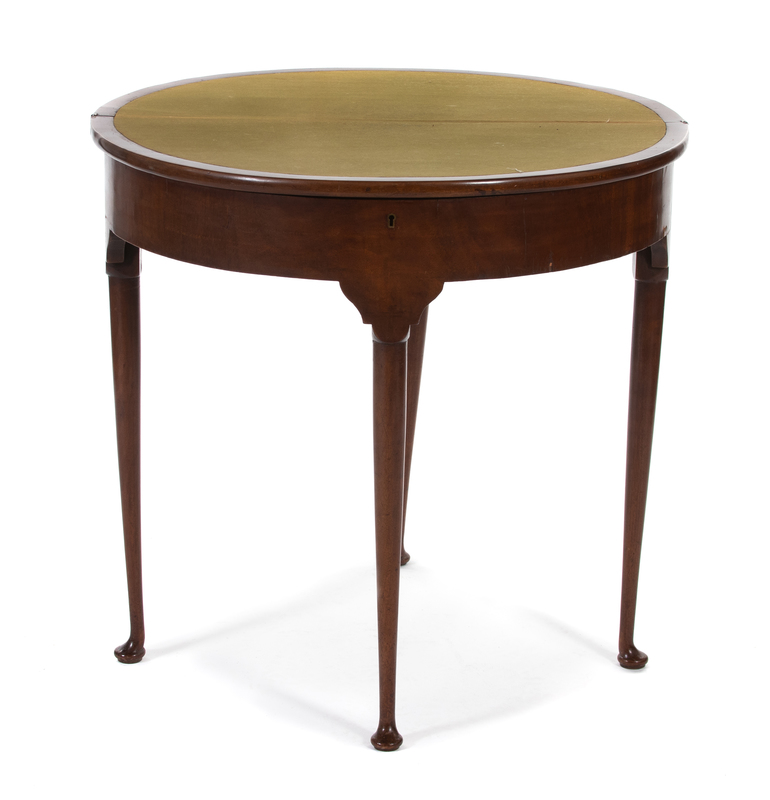 The D-shaped top opening to a green baize-lined surface, raised on tapering cylindrical legs ending in pad feet.