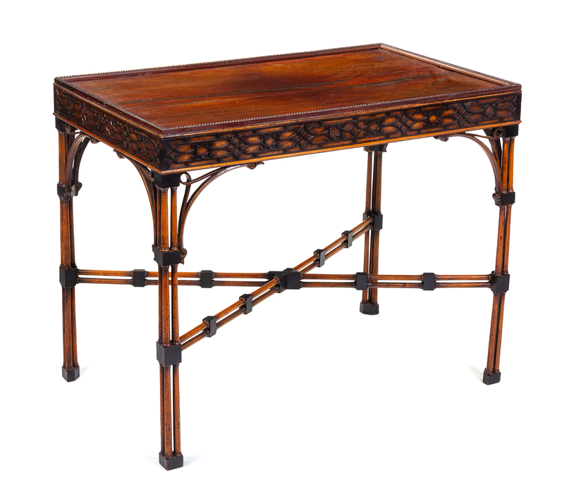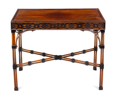 The rectangular top with beaded edge above a blind fretwork frieze set on legs formed of colonnettes and joined by a conforming X-form stretcher.