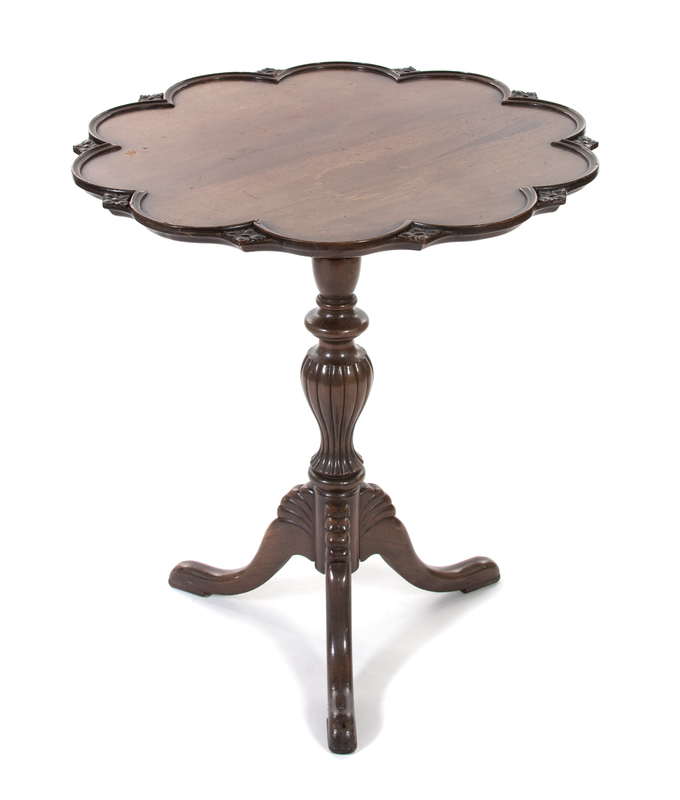 The scalloped top with molded edge over a baluster-form shaft, raised on downswept legs ending in snake feet.