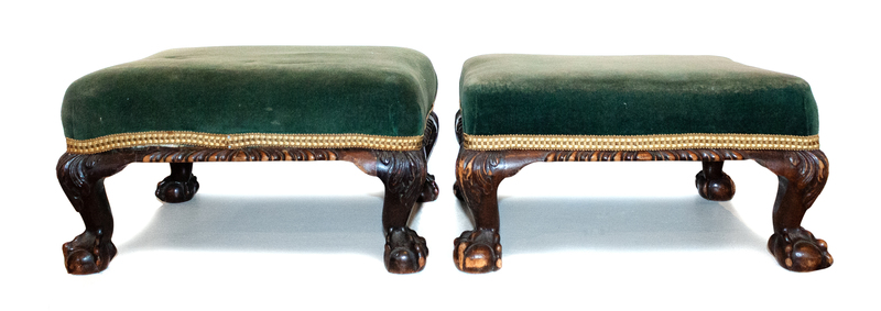 Each upholstered top raised on acanthus-carved cabriole legs ending in claw-and-ball feet.