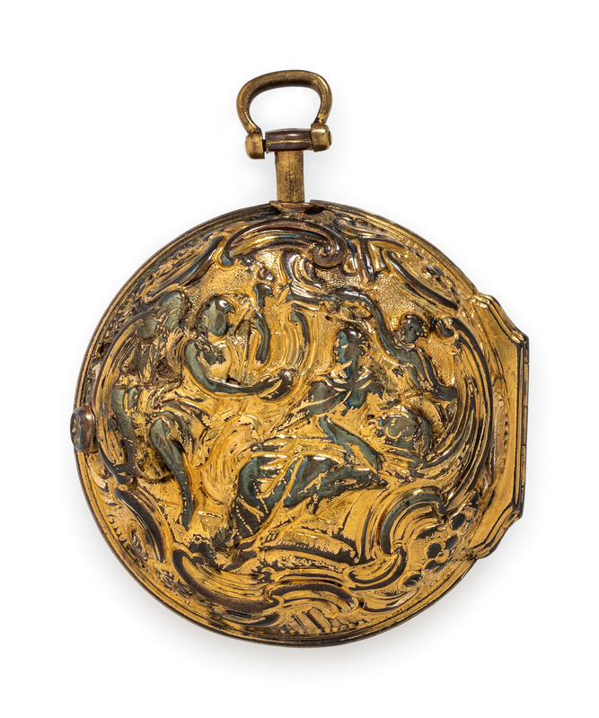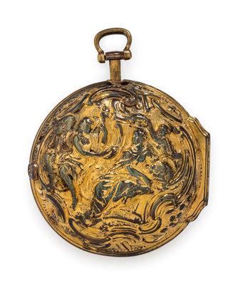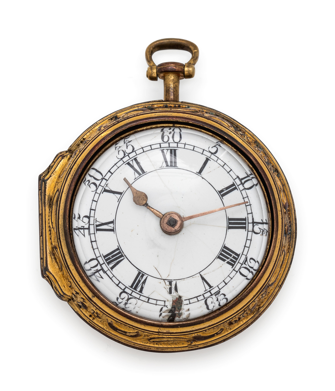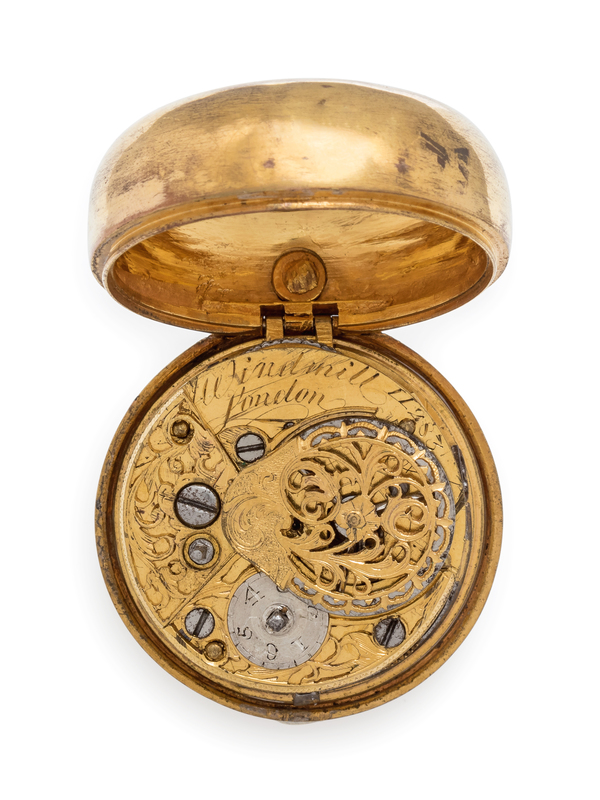 late 18th century, 37.00 mm case diameter, white dial, black enamel Roman numerals with outer chapter ring calibrated to 60 units, gilt spade hands, hinged swing-out key wound and set brass verge fusee movement signed Windmill London, square pillars, pierced and engraved balance cock, 45.00 mm diameter outer gilt metal repousse case.