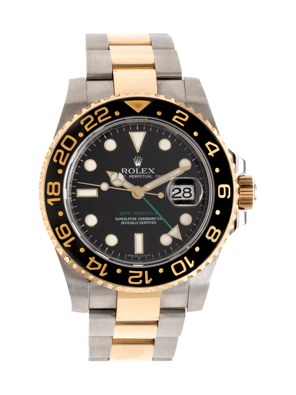 40.00 mm case diameter, black dial signed ROLEX OYSTER PERPETUAL DATE GMT-MASTER II, luminous dot, baton and index numerals, luminous baton hands with center sweep seconds hand and green GMT hand, date aperture at 3 o'clock with magnifier in crystal, bidirectional black ceramic bezel graduated to 24 hours, screw-on case back, Cal. 3186 self-winding movement with a 50-hour power reserve, stainless steel and 18 karat yellow gold Oyster bracelet, deployment clasp.