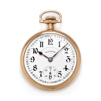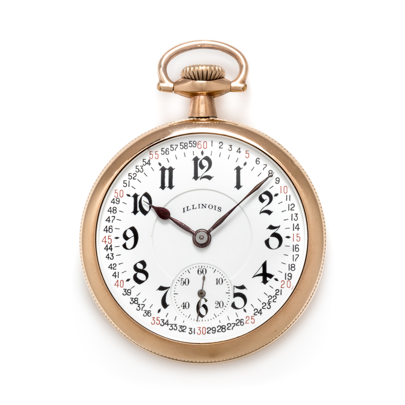 48.00 mm case diameter, white double-sunk dial signed ILLINOIS, Arabic numerals with red and black outer chapter ring calibrated to 60 units, blued steel spade hands, subdial for seconds at 6 o'clock, guilloche engraved case with blank cartouche, stem wound and set 21 jewel nickel movement adjusted to temperature, isochronism and six positions signed ILLINOIS WATCH Co. SANGAMO SPECIAL.