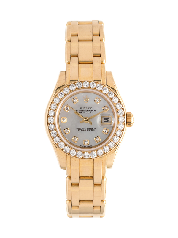 the bezel containing 32 round brilliant cut diamonds, 29.00 mm case diameter, mother-of-pearl dial signed ROLEX, applied diamond numerals, gold baton hands with center sweep seconds hand, date aperture at 3 o'clock with magnifier window in crystal, polished tonneau case, screw on case back, self-winding rhodium plated movement, Pearlmaster gold link bracelet, deployant clasp.