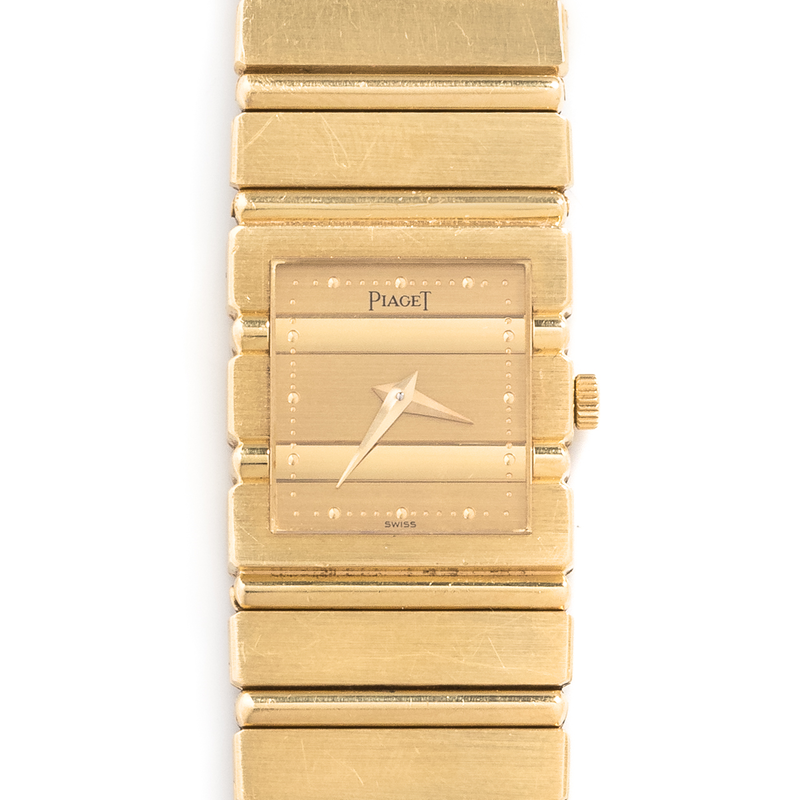 20.00 x 20.00 mm case dimensions, alternating brushed gold and fluted gold dial signed PIAGET, pitched gold dauphine hands, case back affixed with four screws, quartz movement, square case and integrated link bracelet in alternating brushed and polished finish, fold-over clasp.