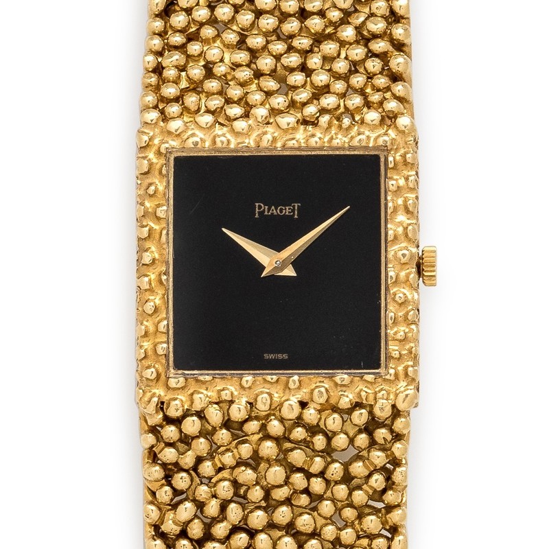 23.00 x 23.00 mm case dimensions, black dial signed PIAGET, yellow gold pitched dauphine hands, case back affixed by four screws, Cal. 9P2 18 jewel manual wind movement adjusted to temperature and five positions signed PIAGET, integrated 'caviar' texture bracelet, folder clasp.