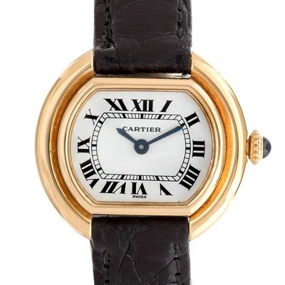 26.00 x 23.00 mm case dimensions inclusive of lugs, white dial signed CARTIER, Roman numerals, blued steel sword hands, polished gold stepped bezel case, case back affixed by four screws, manual wind movement, black crocodile strap signed Cartier, 18 karat gold deployant clasp signed Cartier.