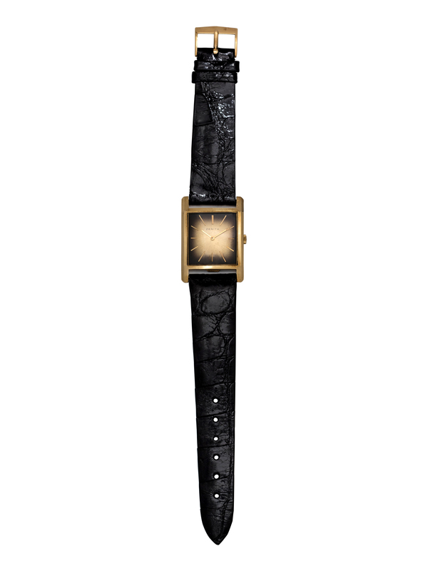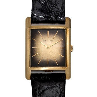 27.00 x 26.00 mm case dimensions exclusive of lugs, black and gold enamel starburst dial signed ZENITH, applied gold baton numerals, gold pencil hands, snap on case back, Cal. 1730 17 jewel manual wind movement signed MOVADO, black leather strap signed VACHERON ET CONSTANTIN, yellow gold tang buckle.