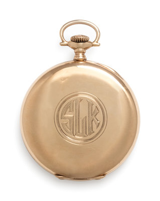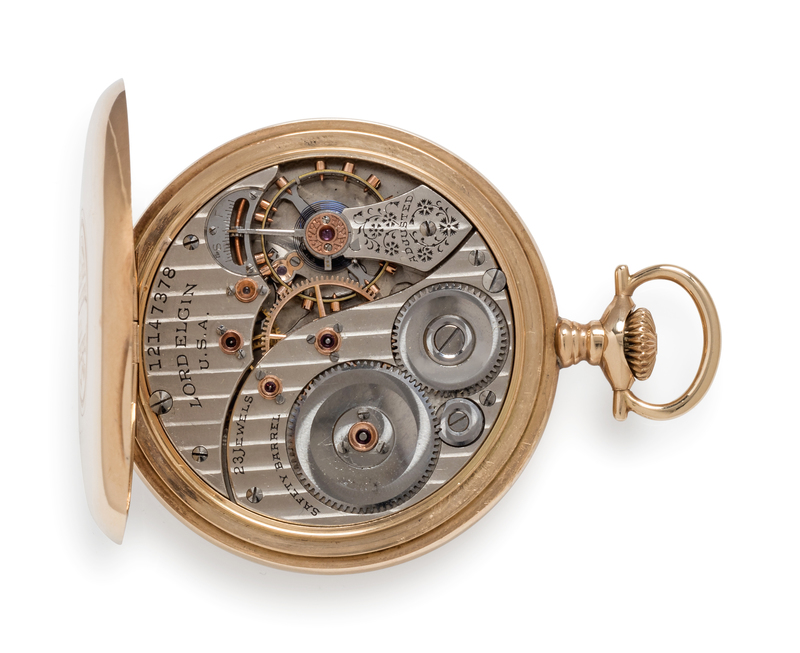 45.00 mm case diameter, white double-sunk dial signed ELGIN, red inner Arabic numerals with black outer chapter ring calibrated to 60 units, blued steel spade hands, subdial for seconds at 6 o'clock, polished case with central engraved monogram, polished cuvette, stem wound and set 23 jewel 3/4 plate nickel movement adjustment to temperature, isochronism and five positions signed LORD ELGIN.