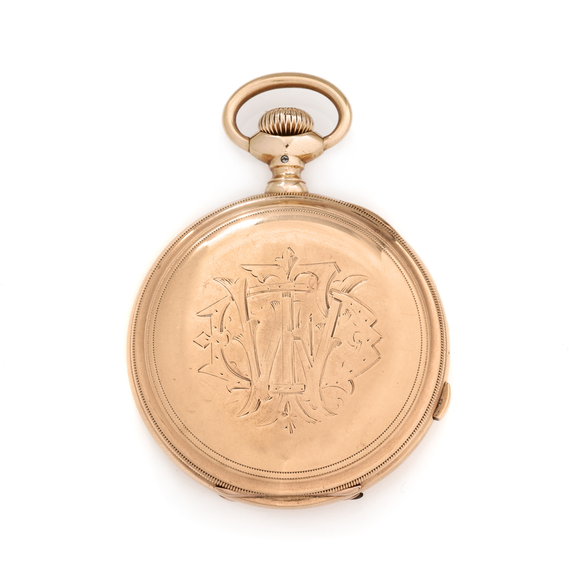 50.00 mm case diameter, white single-sunk dial signed LeCoultre & Co., Arabic numerals with outer chapter ring in red calibrated to 60 seconds, gold Louis XV hands, subdial for seconds at 6 o'clock, pushers in outer band at 11 and 1 o'clock for split seconds chronograph functions, monogrammed case, personalized cuvette, stem wound and lever adjusted nickel movement with damaskeen finish signed LE COUTRE & CO.