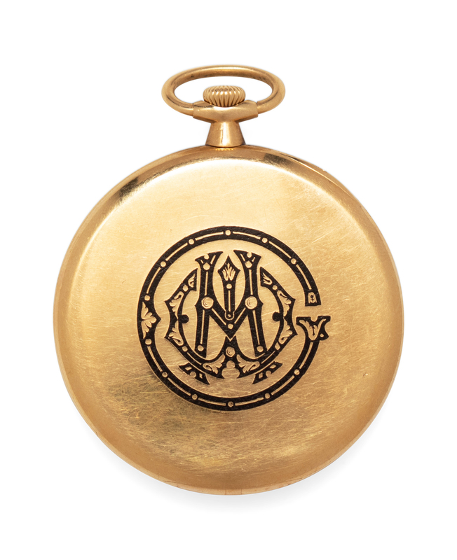 44.00 mm case diameter, champagne single-sunk dial signed PATEK, PHILIPPE & Co, Arabic numerals, blued steel Breguet hands, subdial for seconds at 6 o'clock, case back accented with black enamel monogram, 18 jewel stem wound and set nickel movement with eight adjustments signed PATEK, PHILIPPE & Co.