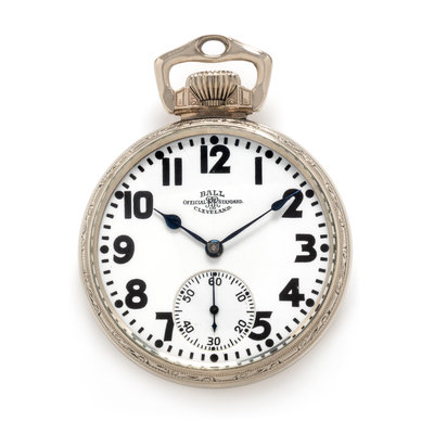 48.00 mm case diameter, white single-sunk dial signed BALL, black Arabic numerals, blued steel spade hands, subdial for seconds at 6 o'clock, polished bezel, engraved case back, stem wound and lever set 21 jewel 3/4 plate nickel movement adjusted to temperature and five positions signed BALL WATCH CO.