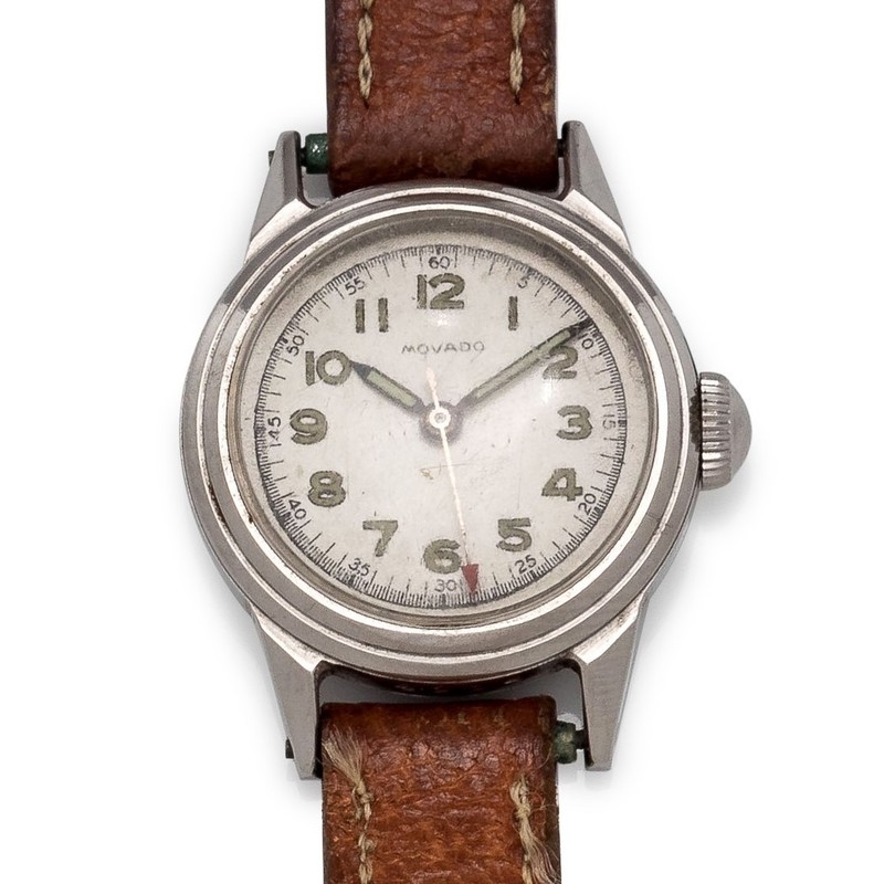 23.00 mm case diameter, matte white dial signed MOVADO, luminous Arabic numerals with outer chapter ring calibrated to 60 units, luminous skeleton hands with red arrow center seconds hand, screw on case back, manual wind 17 jewel movement, later brown leather strap, gold tone tang buckle.