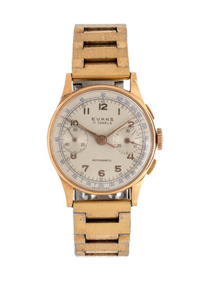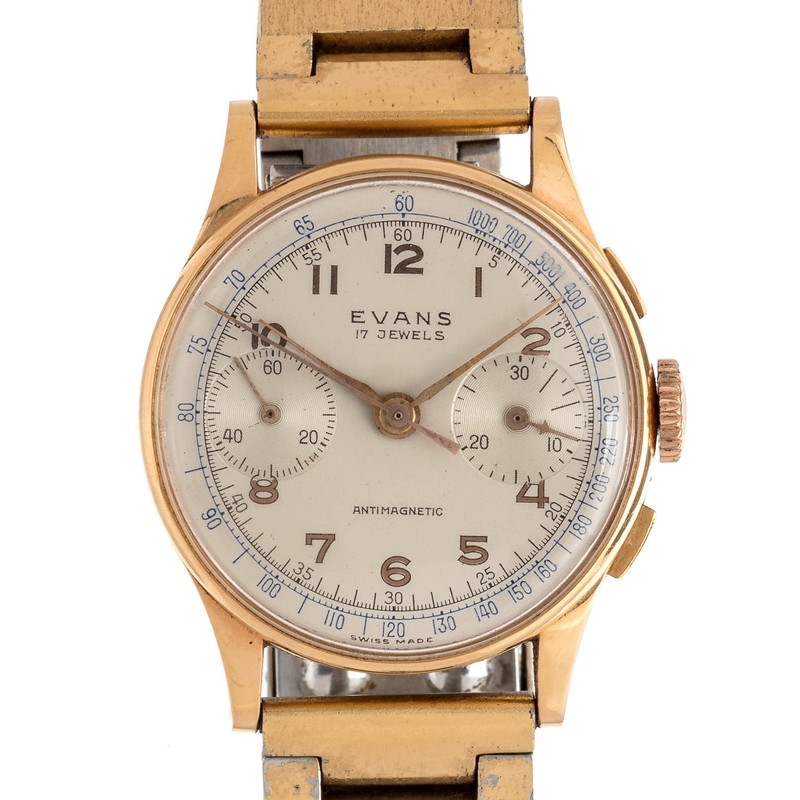 32.00 case diameter, matte silvered dial signed EVANS, rose gold Arabic numerals with outer chapter calibrated to 1000 units, rose gold lancette hands, rose gold chronograph seconds hand, subdials at 3 and 9 o'clock for chronograph minutes and seconds respectively, rectangular pusher buttons at 2 and 4 o'clock, snap on case back, 17 jewel manual wind nickel movement, later gold plated stainless steel link bracelet, deployant clasp.