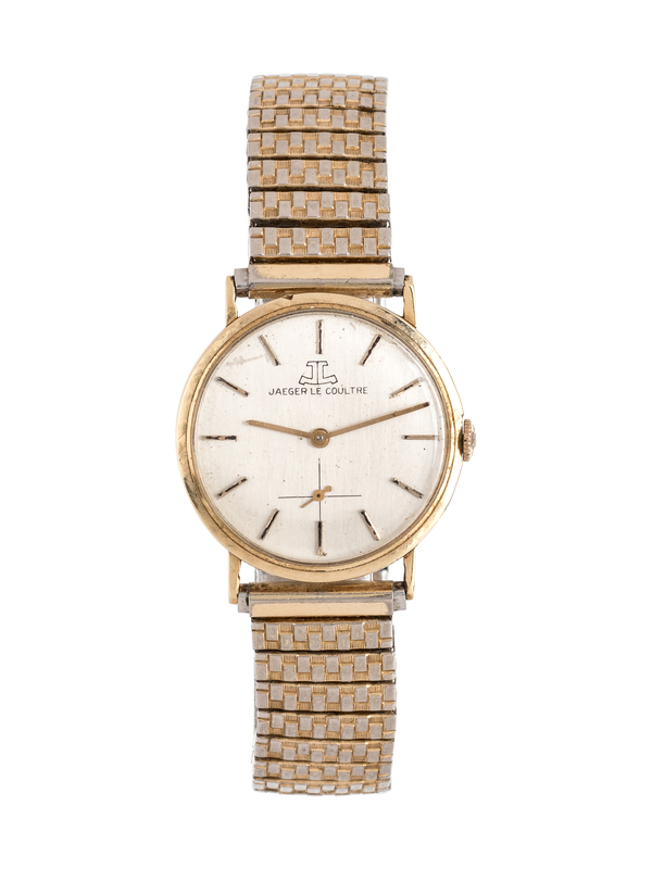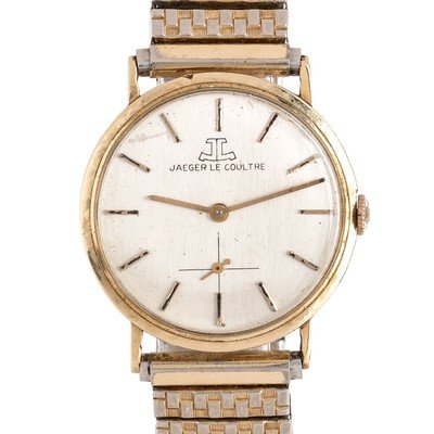 31.00 mm case diameter, matte silvered dial signed JAEGER LE COULTRE, applied gold baton numerals, goold pencil hands, subdial for seconds at 6 o'clock, snap on case back, Cal. K818/CW stem wound and set 17 jewel movement signed LeCoultre Co., later gold tone stretch bracelet.