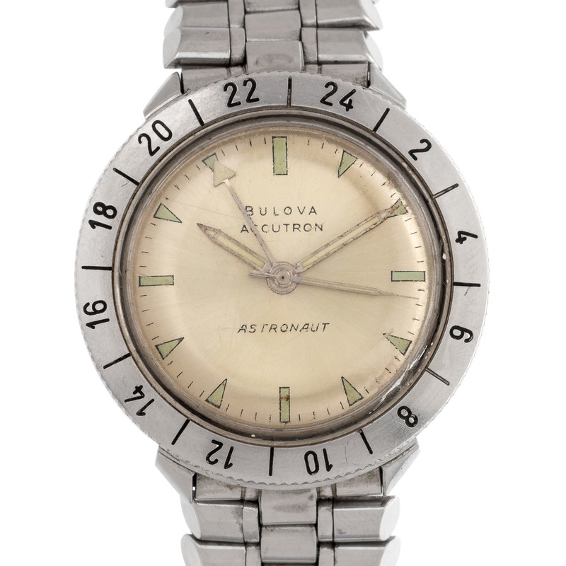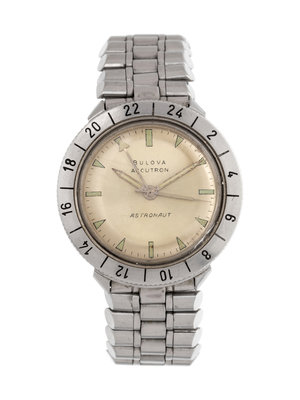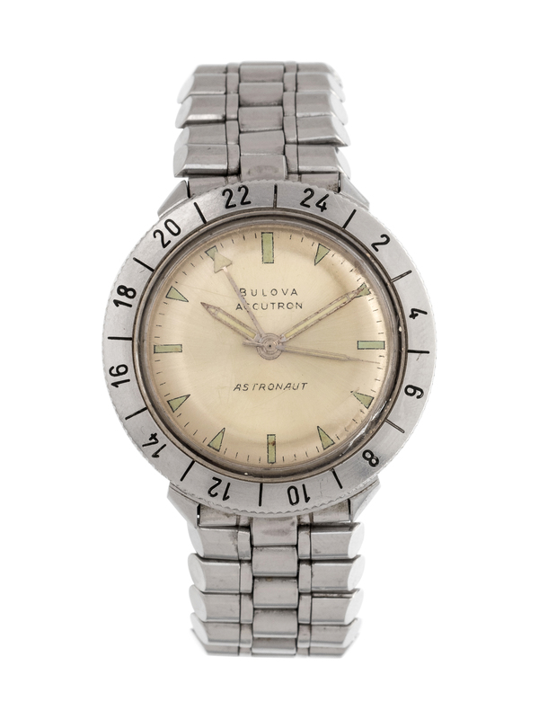 38.00 mm case diameter, matte silvered dial signed BULOVA ACCUTRON ASTRONAUT, luminous baton and arrow numerals, luminous steel skeletonized hands with arrow-tipped GMT and center seconds hands, bidirectional bezel, screw-on case back, Cal. 214 battery movement with tuning -fork oscillator, bullet link bracelet, deployant clasp with Bulova logo.