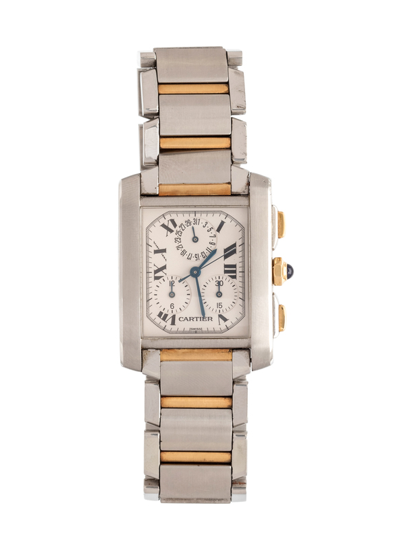 28.00 x 28.00 mm case dimensions exclusive of lugs, ivory dial signed CARTIER with secret signature at 10 o'clock, Roman numerals, blued steel sword hands with chronograph seconds hand, subdials at 4, 8 and 12 o'clock for chronograph seconds, hours and days, chronograph pushers at 2 and 4 o'clock, case back affixed by four screws, quartz movement, steel and yellow gold link bracelet, double deployant clasp.