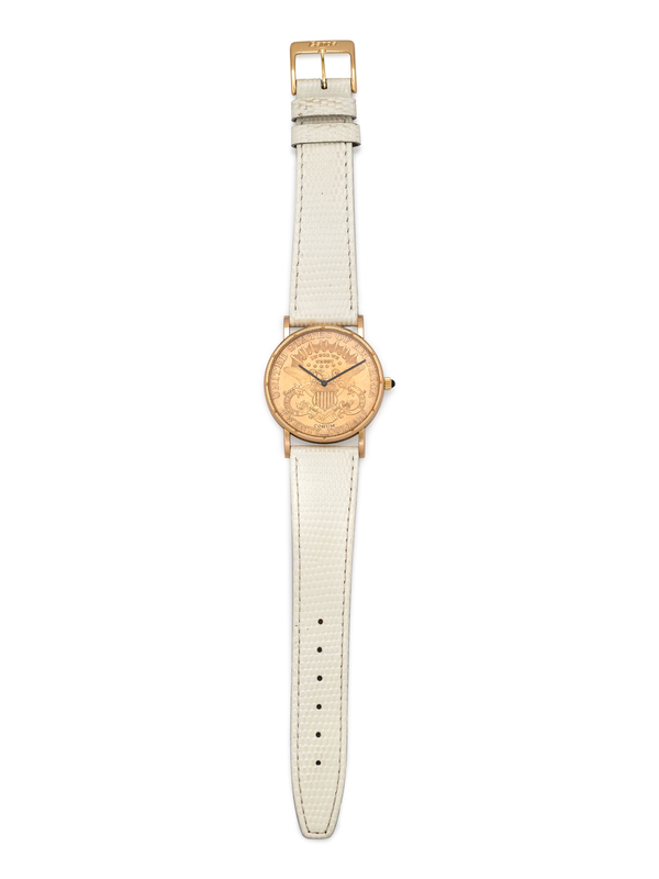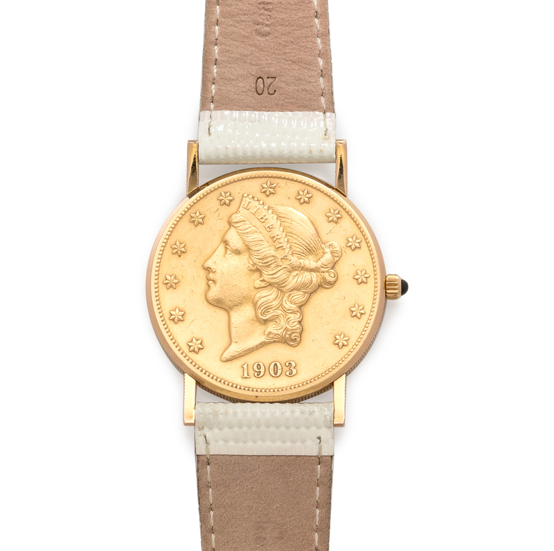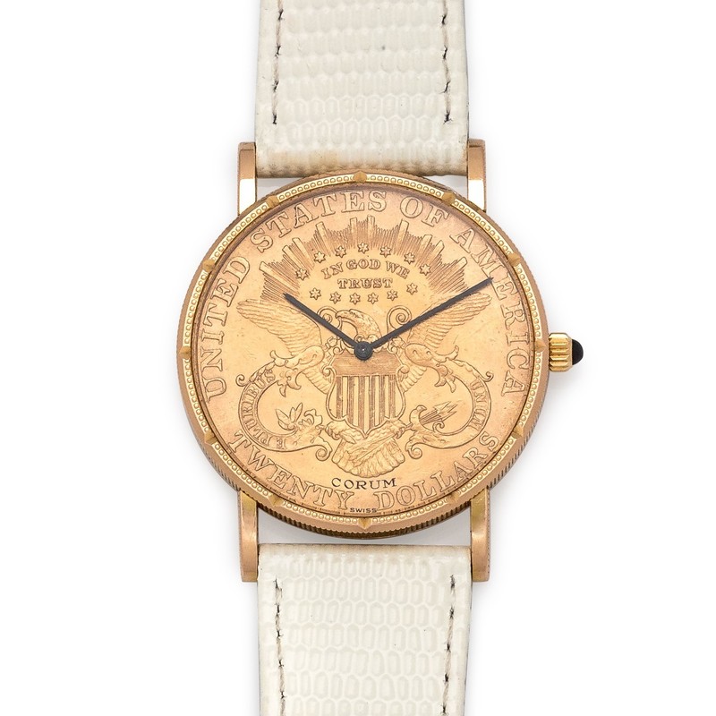 35.00 mm case diameter, dial composed of a $20 gold coin dial signed CORUM and dated 1903, black black pencil hands, 18 jewel self-winding movement adjusted to three positions signed CORUM, white leather strap, gold tone tang clasp.