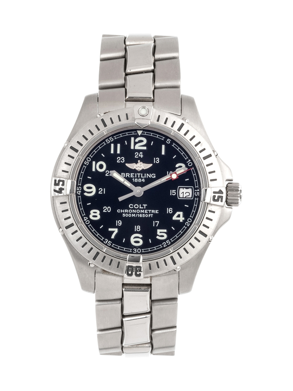 37.00 mm case diameter, black dial signed BREITLING, luminous Arabic numerals with inner chapter ring calibrated to 24 units, luminous steel hands with center hands, date aperture at 3 o'clock, undirectional bezel, screw on case back, quartz movement, brushed and polished steel link bracelet, deployant clasp.