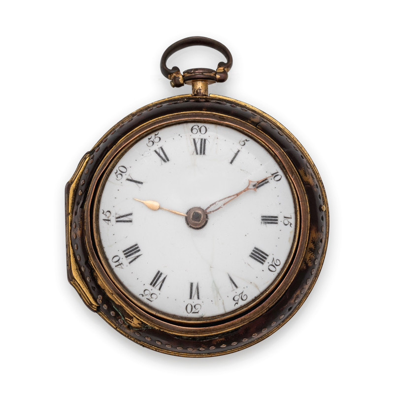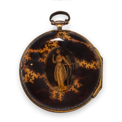 yellow metal and enamel, late 18th century, 38.00 mm case diameter, white dial, black enamel Roman numerals with outer chapter ring calibrated to 60 units, gilt spade and cathedral hands, hinged swing-out key wound and set brass verge fusee movement signed J. Richards LONDON, square pillars, pierced and engraved balance cock, 58.00 mm diameter outer case with tortoiseshell enameled figural design.