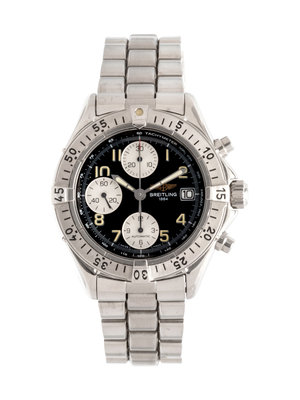 date aperture at 3 o'clock, silver guilloche subdials at 6, 9 and 12 o'clock for chronograph hours, seconds and chronograph minutes respectively, luminous silver sword hands with center chronograph seconds hand, unidirectional turning steel bezel calibrated to 60 units, polished steel tonneau case, chronograph pushers at 2 and 4 o'clock, screw on steel case back, self-winding movement, steel link bracelet, steel deployant clasp signed BREITLING.