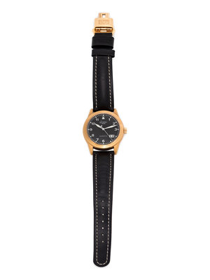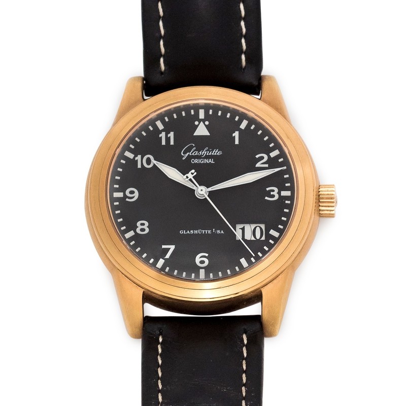 38.00 mm case diameter, black dial signed Glashutte, luminous Arabic and block numerals, luminous sword hands with center sweep seconds hand, date aperture at 4 o'clock, case back affixed with exhibition crystal affixed by five screws, Cal . 39-41 44 jewel self-winding movement signed Glashutte, black leather strap signed Glashutte, 18 karat yellow gold double deployant clasp.