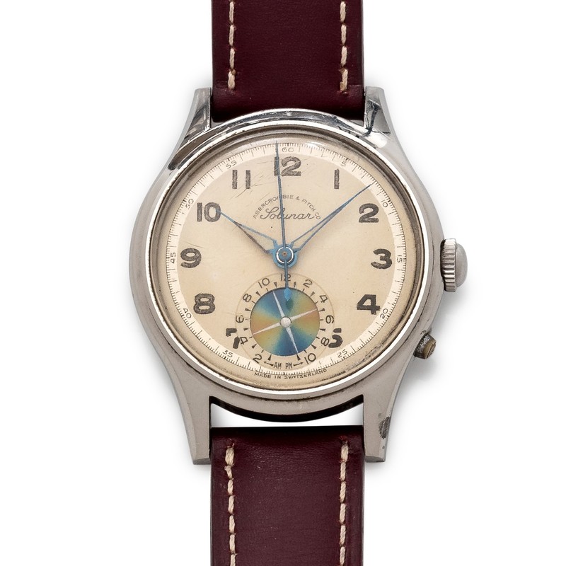 36.00 mm case diameter, two-tone matte silvered dial signed ABERCROMBIE & FITCH CO Solunar, luminous Arabic numerals with polished outer chapter ring calibrated to 60 units, luminous blued steel alpha hands with center sweep seconds, subdial at 6 o'clock for tidal indication with setting button at 4 o'clock, screw on case back, Cal. 90.1 17 jewel manual wind rhodium plated movement signed ABERCROMBIE & FITCH Co., stepped polished and brushed case with turned-down lugs, later dark red leather strap, steel tang buckle.