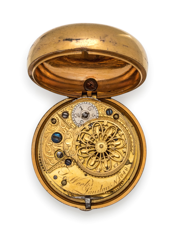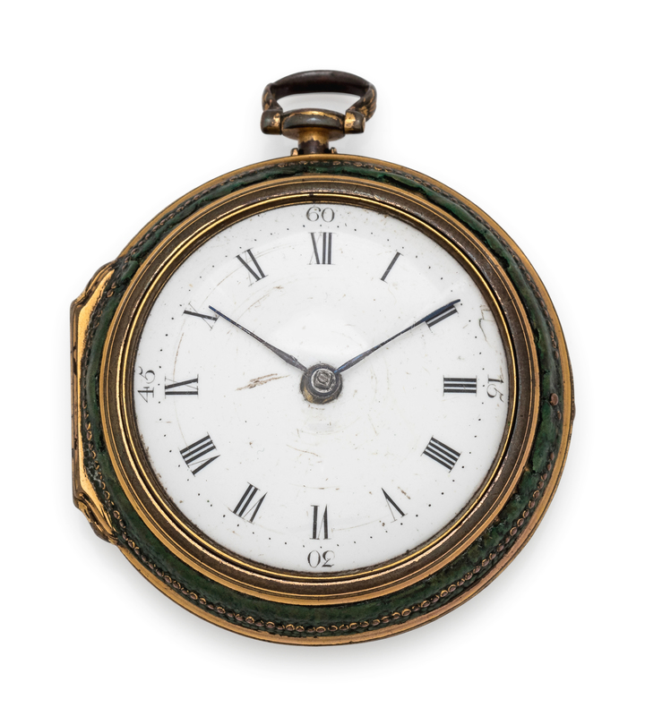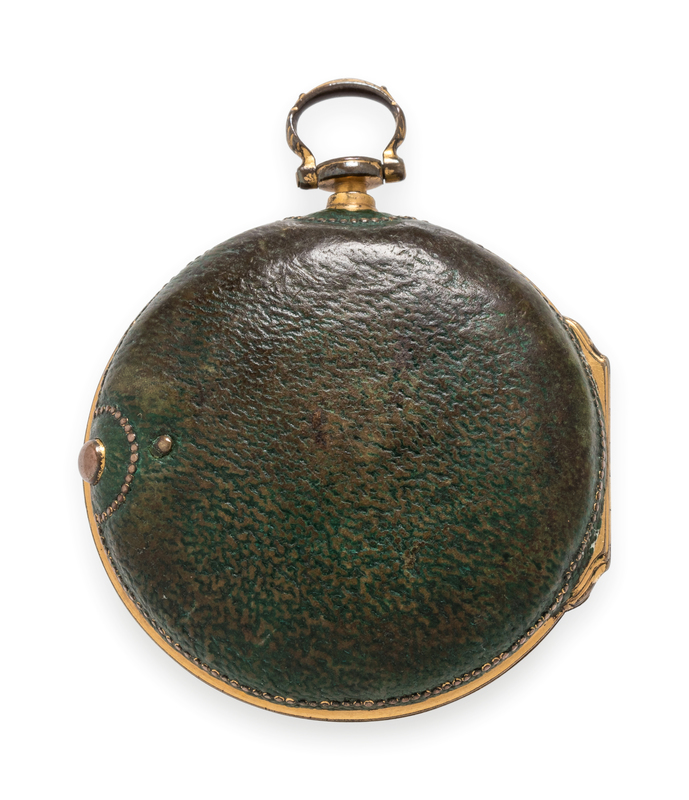gilt metal, late 18th century, 42.00 mm case diameter, white dial, painted Roman numerals with outer Arabic chapter ring calibrated to 60 units, blued steel hands, hinged swing-out key wound and set brass verge fusee movement signed T. Weeks London, angled pillars, pierce and engraved balance cock, 50.00 mm outer diameter nailed pique green leather case.