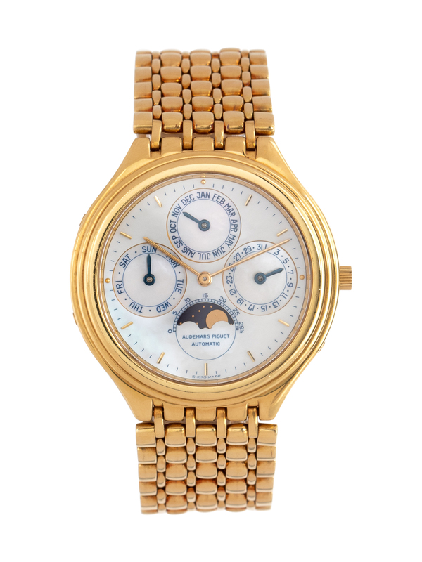 37.00 mm case diameter, mother-of-pearl dial signed AUDEMARS PIGUET, applied gold baton numerals, gold pencil hands, subdials at 3, 9 and 12 o'clock for date, moonphase, day and month respectively, setting buttons at 4, 8 and 10 o'clock, beveled polished bezel, snap-on case back, Cal. 2120/2 38 jewel self-winding movement adjusted to heat, cold, isochronism and five positions with a 21c gold rotor signed AUDEMARS PIGUET, 18 gold link bracelet, double deployant clasp.