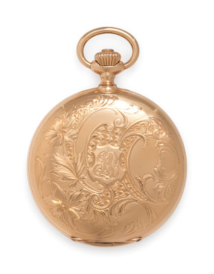 53.00 mm case diameter, brushed steel single-sunk dial signed SCHUPBACH & Cie HANKOW CHINE, Roman numerals, blued steel spade hands, subdial for seconds a 6 o'clock, foliate motif engraved case with monogrammed cartouche, engraved cuvette, stem wound and lever set 20 jewel nickel movement.