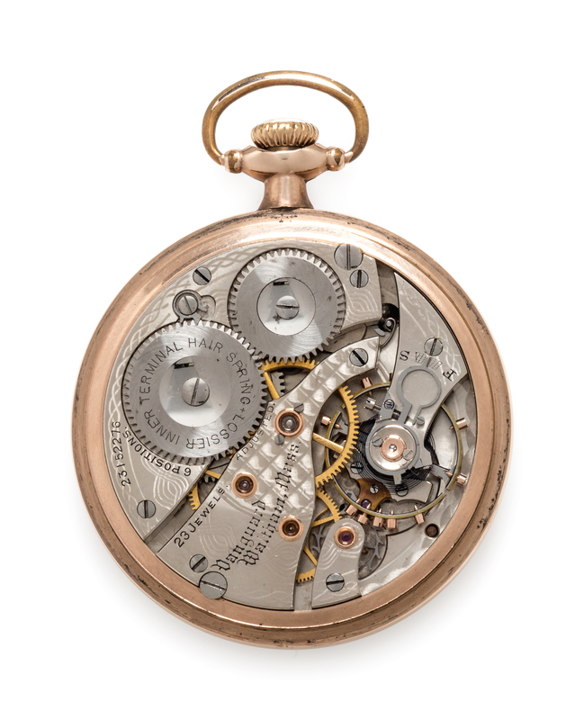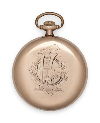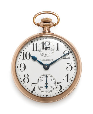 48.00 mm case diameter, white dial signed Waltham, Roman numerals, blued steel spade hands, subdial for seconds at 6 o'clock, up/down 24 hour power reserve indicator at 12 o'clock, monogrammed case back, key wound and lever set 23 jewel 3/4 bridge plate movement adjusted to six positions with damaskeen finish signed Waltham.