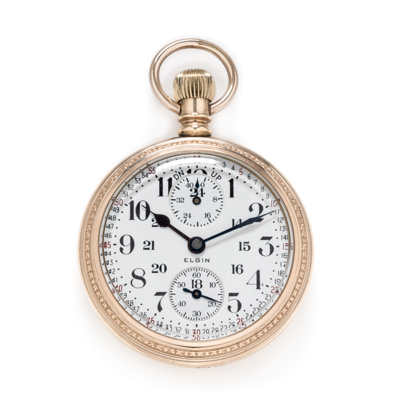55.00 mm case diameter, white double-sunk dial signed ELGIN, Arabic numerals with inner track calibrated to 24 units and outer red and black track calibrated to 60 units, blued steel spade hands, subdial at 12 and 6 o'clock for 40 hour power reserve indication and small seconds respectively, polished case back, stem wound and lever set 21 jewel nickel 3/4 plate movement adjusted to temperature, isochronism and five adjustments with a double roller, gilt inlay, gold setting screws and damaskeen finish signed FATHER TIME ELGIN ILL.