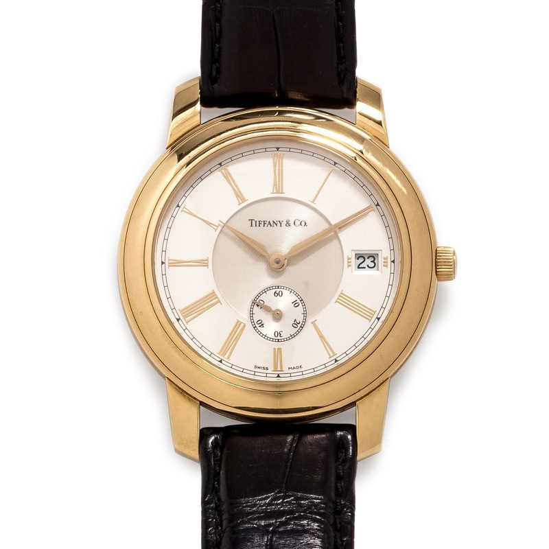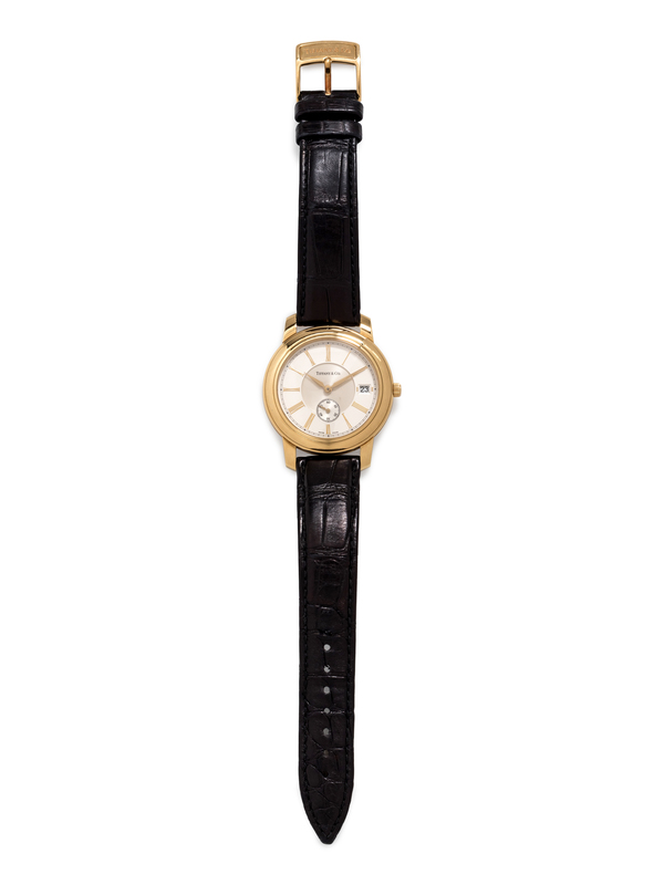 36.00 mm case diameter, matte silvered dial signed TIFFANY & CO., applied gold Roman numerals, gold pitched alpha hands, subdial for seconds at 6 o'clock, date aperture at 3 o'clock, case back affixed by four screws, quartz movement, black alligator strap signed TIFFANY & Co., 18 karat yellow gold tang buckle signed TIFFANY & CO.