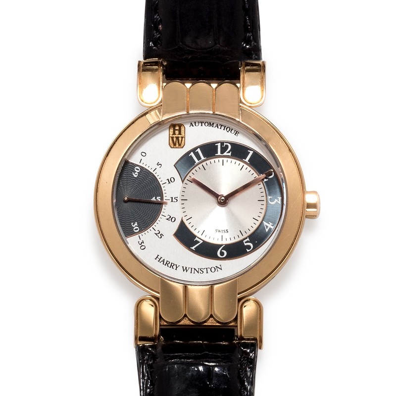 38.00 mm case diameter, matte steel dial signed HARRY WINSTON, rose gold fils hands, black and steel Arabic numerals, excentered hours and minutes, retrograde subdial seconds at 9 o'clock, snap on case back with exhibition crystal, Cal. 3196 28 jewel self-winding movement signed HARRY WINSTON, black crocodile strap signed Harry Winston, 18 karat pink gold deployant clasp.