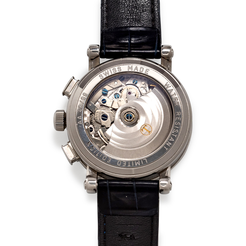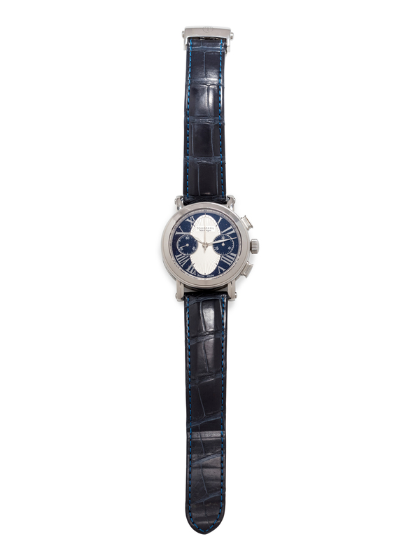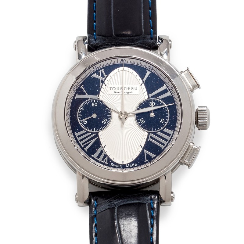 41.00 mm case diameter, blue dial with white guilloche center signed TOURNEAU, applied steel Roman numerals, luminous losange hands, subdials at 3 and 9 o'clock, screw-down case back with exhibition crystal, 30 jewel self-winding movement, dark blue alligator strap signed TOURNEAU, stainless steel deployant clasp.