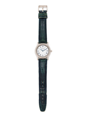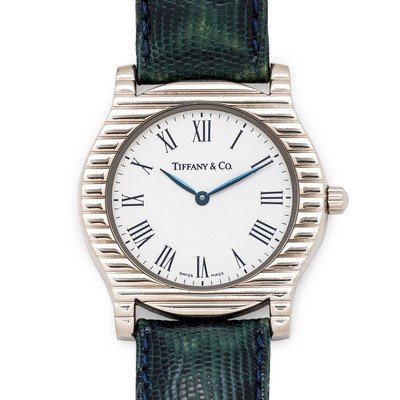 32.00 mm case diameter, white dial signed TIFFANY & Co., black Roman numerals, blued steel feuille hands, ribbed tonneau case, snap on case back, quartz movement, green leather strap signed TIFFANY & CO., 18 karat white gold ribbed tang buckle signed TIFFANY & CO.