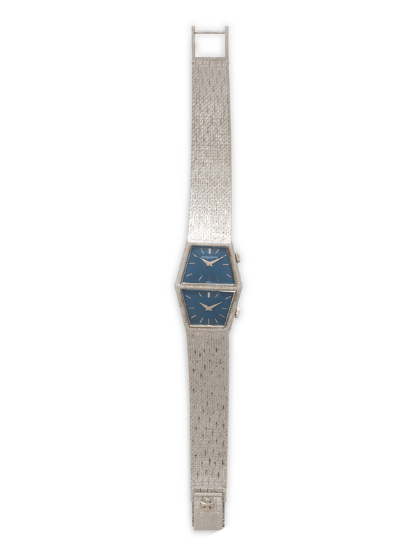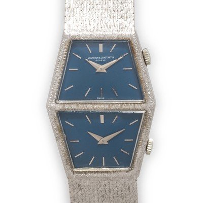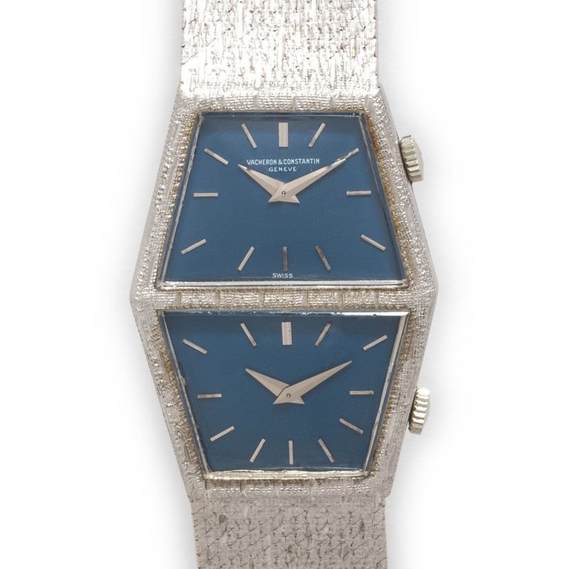 26.00 x 35.00 mm case dimensions, matte blue dual dials signed VACHERON CONSTANTIN, applied silver baton numerals, silver pitched dauphine hands, barrel shaped case, snap on case back, dual Cal. K.1050/8 20 jewel manual wind movements adjusted to heat, cold, isochronism and five positions signed Vacheron Constantin, integrated textured mesh link bracelet, fold-over clasp with Vacheron Constantin logo.