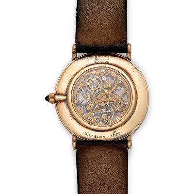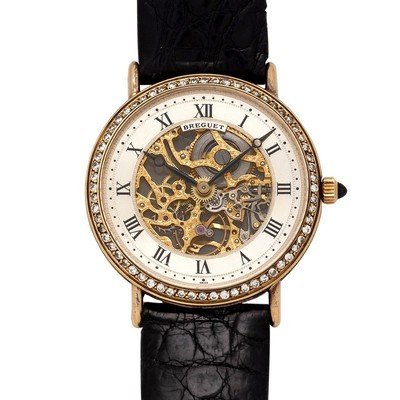 the bezel containing 64 round brilliant cut diamonds weighing approximately 0.32 carat total, 33.00 mm case diameter, skeletonized dial signed BREGUET, Roman numerals, black Breguet hands, snap on case back with exhibition crystal, intricately skeletonized manual wind movement, black leather strap, 18 karat yellow gold tang buckle.