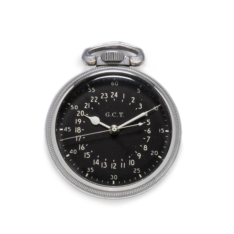 50.00 mm case diameter, black dial signed G.C.T., Arabic numerals with inner chapter ring calibrated to 24 hours, white spade hands with center sweep seconds hand, stem wound and set 22 jewel 3/4 plate nickel movement adjusted to temperature and six positions signed HAMILTON WATCH CO U.S.A U.S.ARMY AIR CORPS.