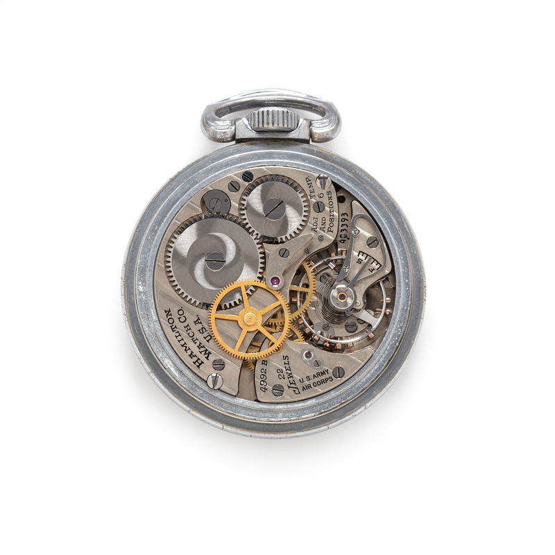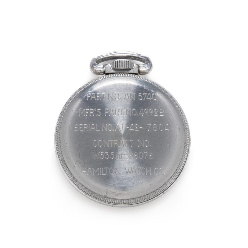 Case back engraved: PART NO. AN 5740 MFR'S PART NO. 4992B SERIAL NO.AF-42-7804 CONTRACT NO. W535o.c-28072 HAMILTON WATCH CO.