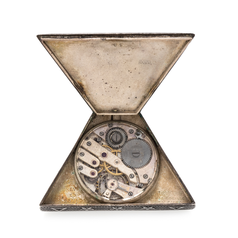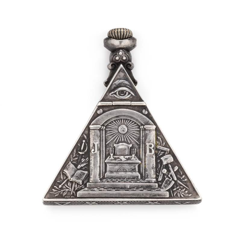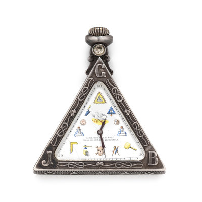 53.00 mm case width, white dial, polychrome Masonic symbol numerals with outer outer chapter ring calibrated to 60 units, blued steel moderne hands, triangular case with numerous Masonic symbols and one round paste stone, hinged case back, stem wound and set 15 jewel nickel movement with three adjustments.