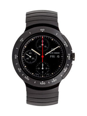 40.00 mm case diameter, matte black dial signed PORSCHE DESIGN, luminous block numerals, luminous white pencil hands with orange chronograph center hand, subdials at 6, 9 and 12 o'clock for chronograph hours, seconds and minutes respectively, outer bezel calibrated to 350 units, chronograph push buttons at 2 and 4 o'clock, screw on case back, self-winding movement, matte black link bracelet, deployant clasp.