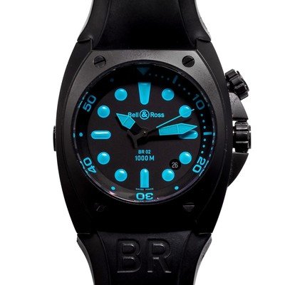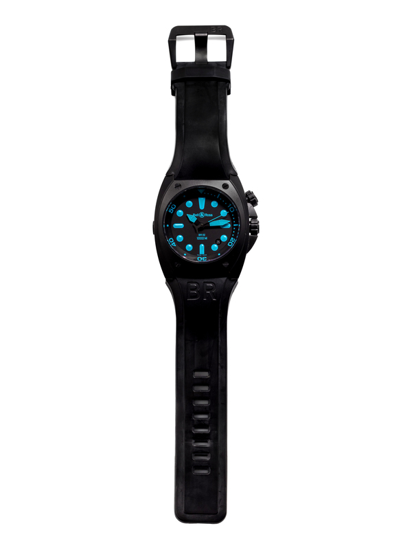 44.00 x 49.00 mm case dimensions, black dial signed Bell & Ross, luminous blue dot and baton numerals within bezel chapter ring calibrated to 60 units, luminous blue sword hands with center sweep seconds hand date aperture between 4-5 o'clock, crown for inner rotating bezel at 2 o'clock, screw-down case back, self-winding movement, black rubber strap, tang buckle.