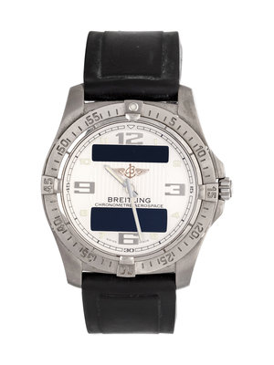 41.00 mm case diameter, white textured dial signed BREITLING, applied silver and luminous numerals, twin LCD displays at 12 and 6 o'clock allowing chronograph, calendar, world time and alarm functions, luminous silvered pencil hands, unidirectional bezel calibrated to 60 units, snap-on case back, Cal. 75 quartz movement, rubber strap signed BREITLING, deployant clasp signed BREITLING.